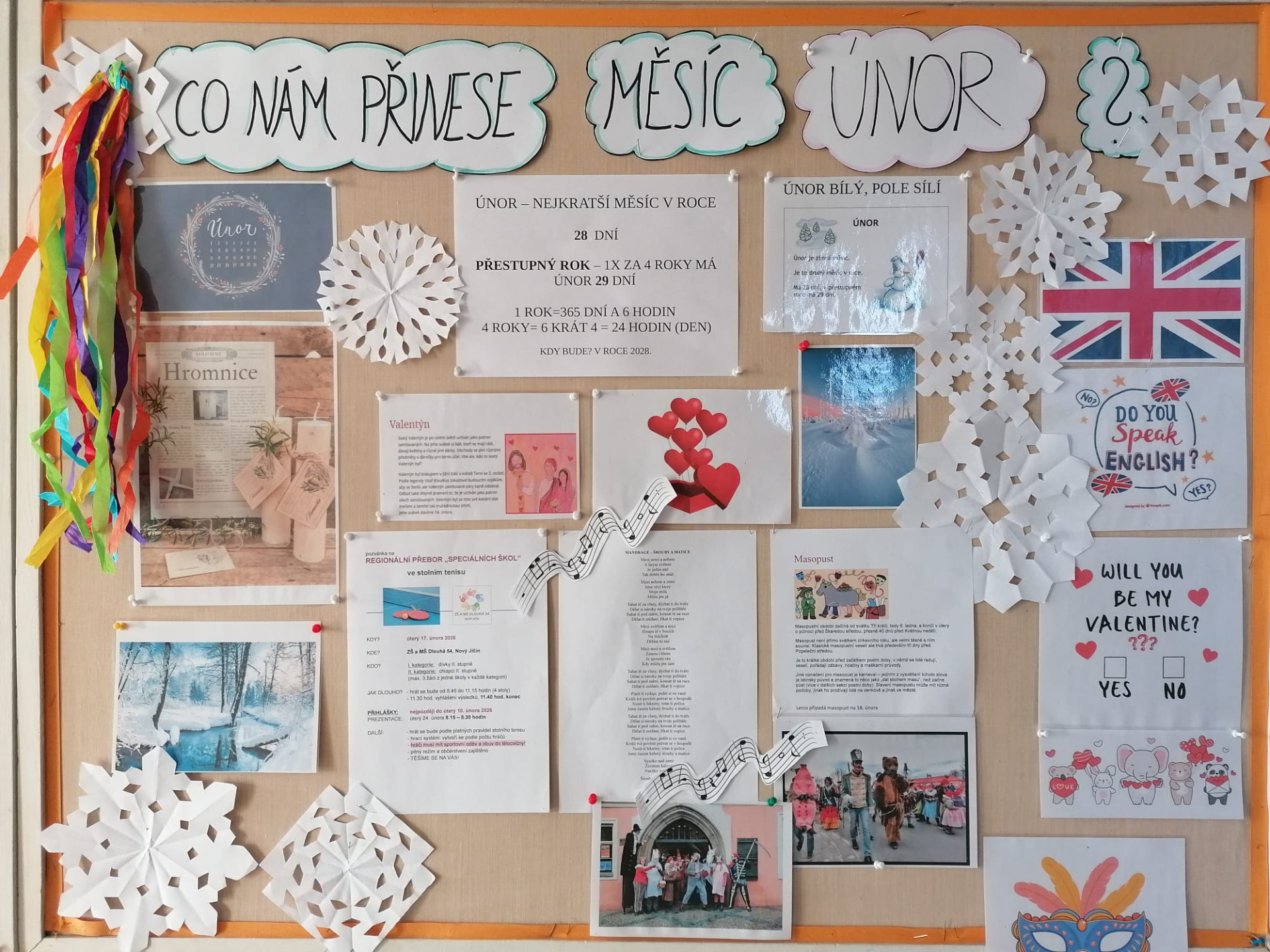 Masopustní období - projektové vyučování, Hromnice – o hodinu více – a svátek má Nela, Turnaj ve stolním tenise – Nový Jičín – žáci druhého stupně – cestování – reprezentace, Valentýn – výtvarné, hudební a pracovní činnosti ke svátku zamilovaných, Časová orientace – procvičování časových údajů – poznávání a určování hodin – únorové pranostiky, Finanční gramotnost – mince – bankovky – hodnota zboží a služeb – manipulace s penězi – slovní úlohy praktického charakteru – pochopení a řešení reálné situace s matematickým obsahem, Do you speak English? – anglická slovní zásoba ke zvoleným tématům – anglicky jednoduše, správně a s porozuměním – žákovské jazykové dovednosti, Návykové látky – školní preventivní program – posilování sociálních dovedností – zdravý životní styl – dlouhý život ve zdraví. P R O N Á S V Š E CH N Y. V. Wolf Kvitová, A. Kleslová