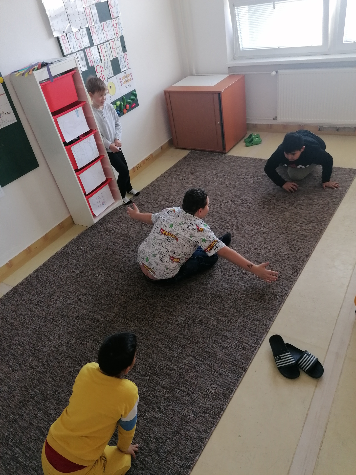 Žáci při aktivním odpočinku načerpávají, co je potřeba. Každý si může zvolit, jestli chce trávit přestávky raději v činnosti o samotě, nebo jestli si se spolužákem/spolužáky zahraje např. vybranou stolní hru či něco nenáročně pohybového na koberci, u čehož "dohledově strážíme". Že, paní asistentko?