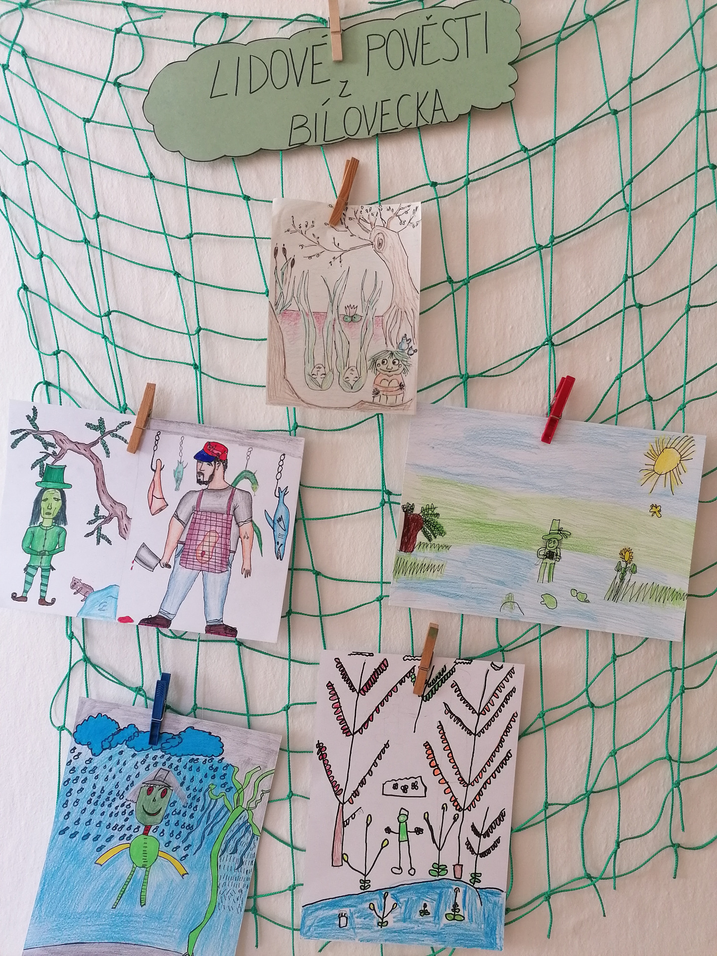 Žáci II. D si v rámci předmětu Výtvarná výchova vyzkoušeli ilustrovat čtený literární text. Jako předloha jim sloužila pověst Vodník na Dvorku z knihy Lidové pověsti z Bílovecka od Zdeňka Kuchty.