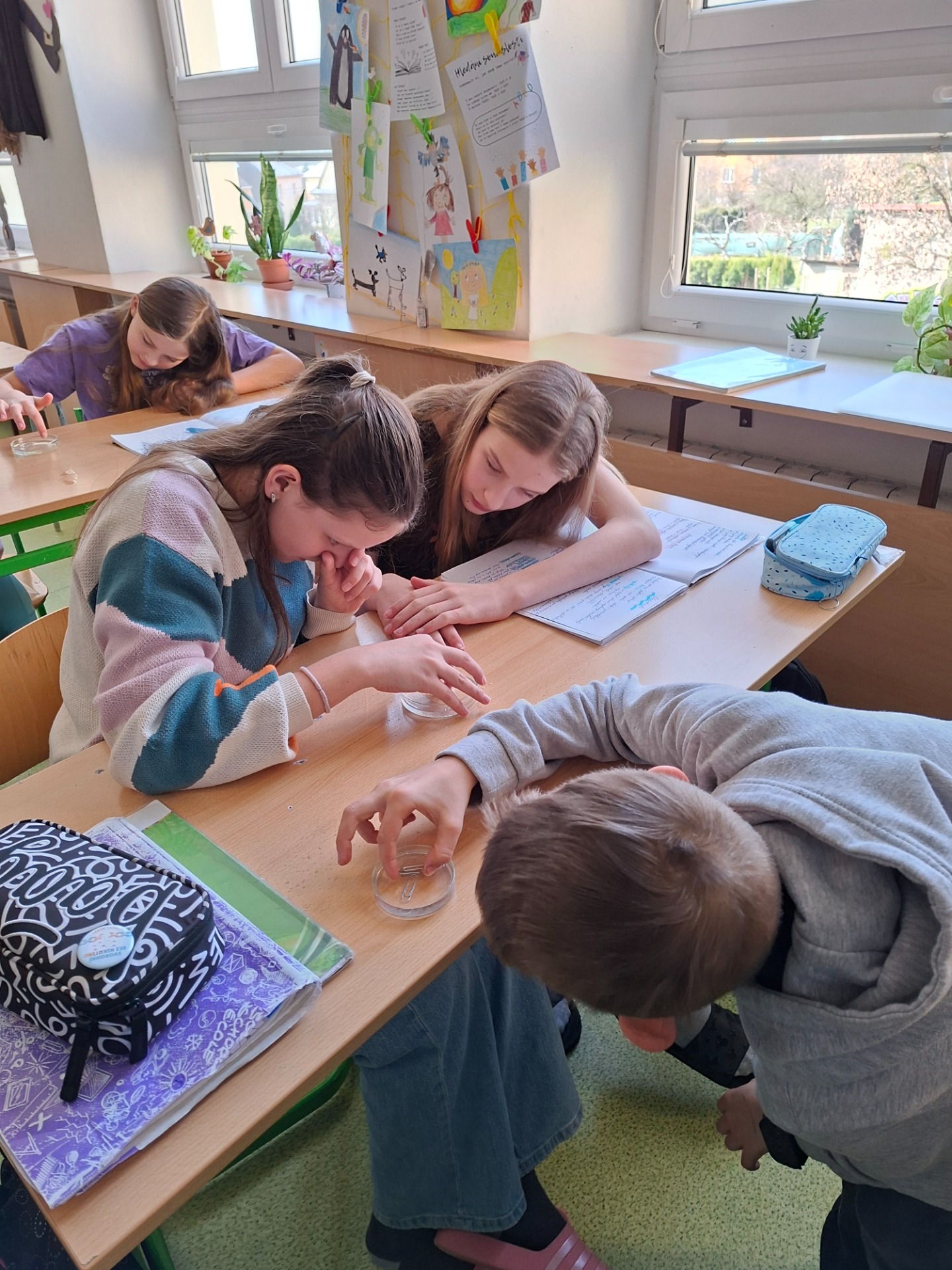 My jsme nahradili bruslařky a vodoměrky obyčejnými sponkami na papír a vyzkoušeli si je položit na vodní hladinu. Poté jsme kápli trošku jaru do vody se sponkou a sledovali, jak se se tímto blanka naruší a sponka okamžitě klesá ke dnu. Dokázali jsme tak, že znečištění vody má fatální vliv na žijící organismy, a proto je třeba udržovat životní prostředí čisté.