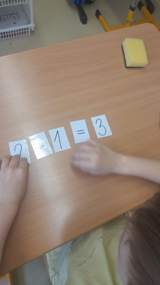 Manipulací s různými předměty a jejich počítáním se postupně dostáváme k číselnému zápisu, u kterého musíme dodržet správné psaní číslic, zápis čísel, symbolů + a také =. Čtení početních příkladů, jejich zápis a správný výpočet se pro nás stává zábavnou aktivitou také při manipulaci s číselnými kartičkami, které simulují zápis příkladů na sčítání. Také jsme KARTIČKOVÉ MANIPULACE S ČÍSLY využili při dočítání, rozkladu i řazení čísel podle velikosti, při psaní početních příkladů se záměnou sčítanců na psací tabulku.
