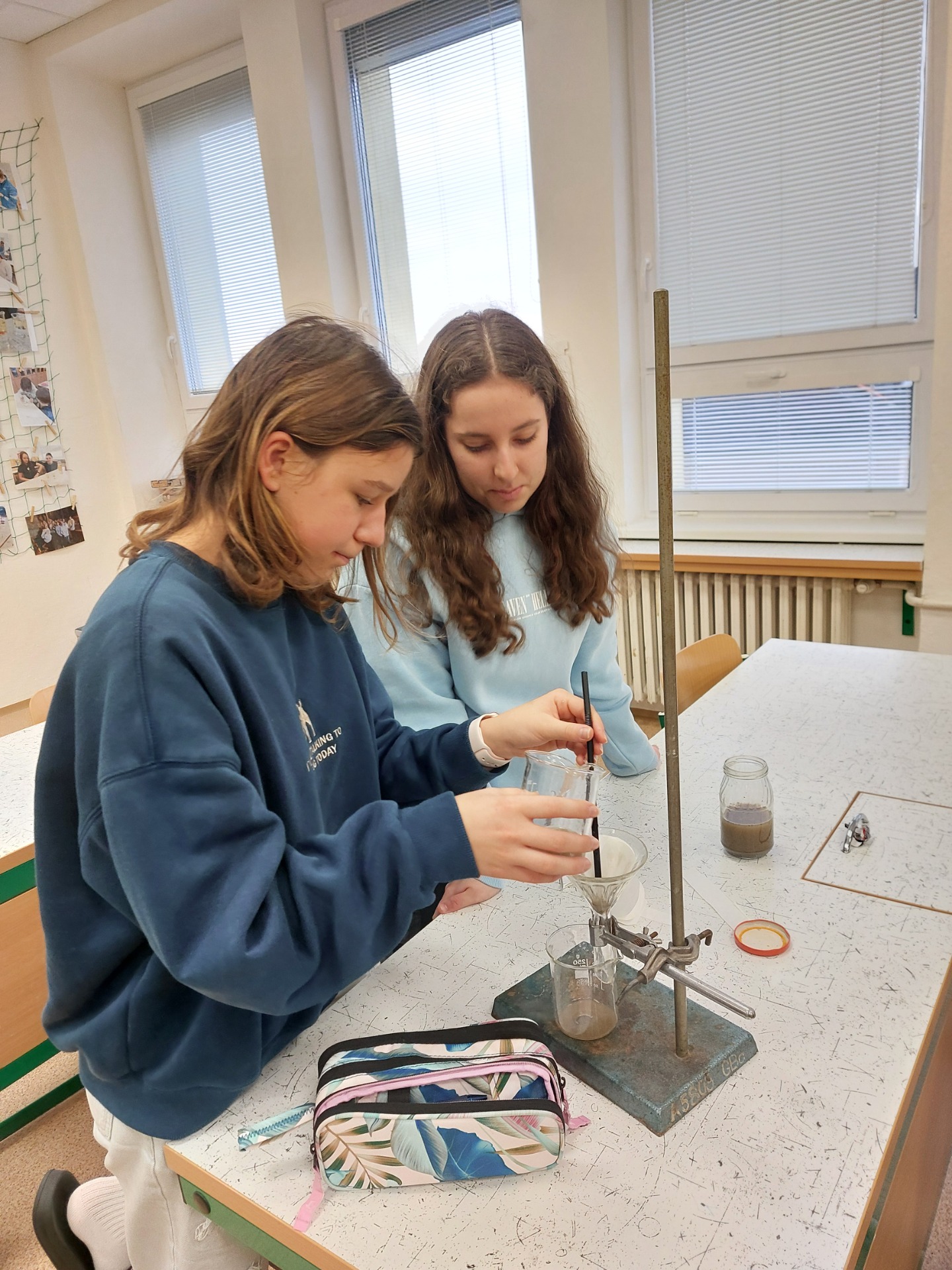 Žáci 8. ročníků se ve chemii zabývají metodami oddělování směsí. Prakticky si vyzkoušeli filtraci přinesené směsi, ať už se jednalo o směs písku ve vodě, tureckou kávu, znečištěnou vodu z akvária nebo koncentrovanou ovocnou šťávu. Ověřili si, jak je důležité použít kvalitní filtr, aby byla filtrace co nejefektivnější a filtrát co nejčistší. Další metodou byla chromatografie, kdy si žáci vyzkoušeli rozložit barvy na jednotlivé složky. Rychlejší byly vždy ty barevné pigmenty, které se méně vázaly na pevnou složku. Vznikaly tak proužky různých odstínů.