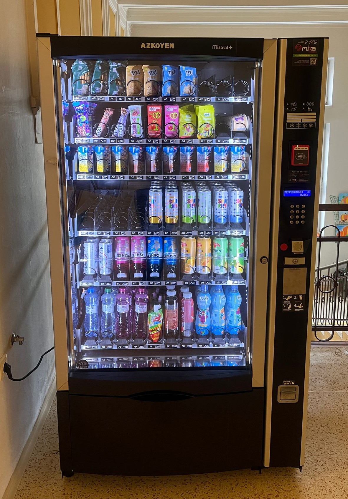 Automat nabízí oblíbené produkty, jako jsou mléčné nápoje Kravík, Jupíky, různé druhy vody Rajec, bagety, tyčinky a mnoho dalších svačinek.