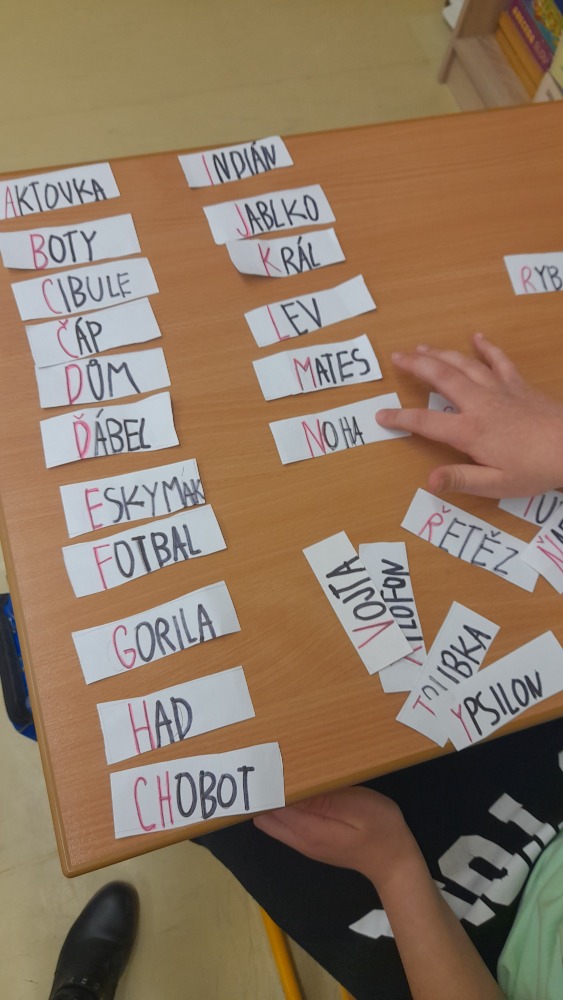 U psaní slov si procvičili hůlkové písmo a také se rovnou soustředili na estetické hledisko písma, tedy grafické ztvárnění znaků – písmen abecedy – při jejich psaní. Instrukce zněla "velkým, hůlkovým, čitelně, správně, úhledně". Na kartičkách je vidět, že pokyn pochopili a samostatně pracovali. Při tvoření slov na písmena, která jsou v naší abecedě, jsou ale písmena pro začátek slov méně běžná, tak použili zčásti nápovědu naši učitelskou, zčásti si pak sami vyhledávali v abecedních tabulkách, které mají běžně k dispozici k názorné dopomoci.