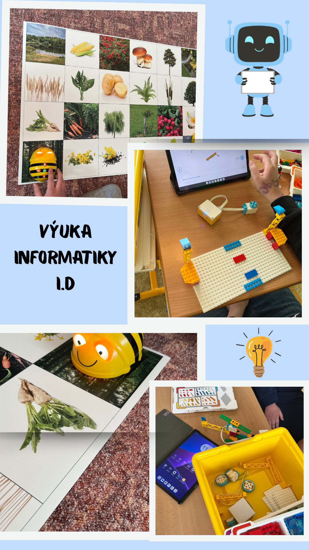 Informatika ve 4. a 5. ročníku není pouze o seznamování se s počítačem nebo jeho obsluha, je to také příprava na složitější myšlenkové operace, které přichází na 2. stupni ZŠ. Pro tyto účely jsou využívány zařízení pracující na principu jednoduchého programování a pomáhají tak rozvíjet logické uvažování žáků. V rámci výuky využíváme například programovatelnou robotickou včelku Blue-Bot či Bee-Bot nebo interaktivní stavebnici Lego Spike Educational, která je propojená s tabletem. Žáci pak mohou postavenou stavebnici také rozpohybovat a zkoumat tak možnosti programování k různým možnostem pohybu. A. Kleslová, vyučující